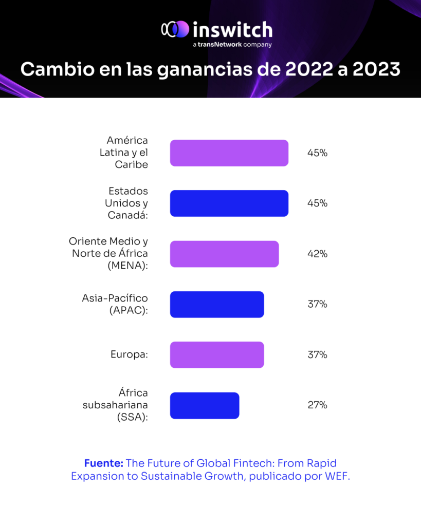 Según las cifras del WEF, América Latina y el Caribe lidera entre las regiones que presentan tasas de crecimiento de ingresos fintech por encima del promedio (46 %), por delante de Asia Pacífico (44 %).